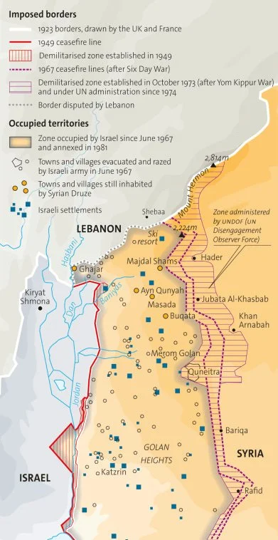 Invaded by Israel in 1967, then annexed in 1981, the Golan Heights are considered as occupied territory by the UN. The plateau dominates Galilee and the Damascus plains, and is a key source of water, which Israel appropriates to the detriment of Syria. Source: Le Monde Diplomatique